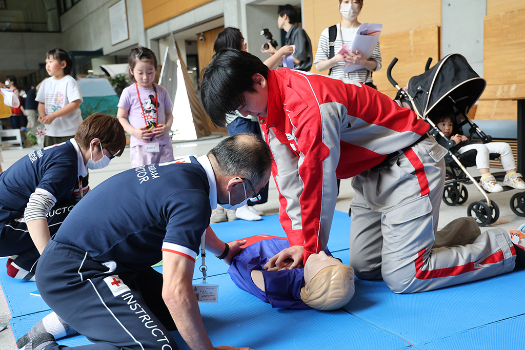 AED講習: 日本赤十字社の協力のもと、AED講習と傷の手当講習を実施 。マスコットキャラクターのハートラちゃんも登場します!大切な人の命を守るため、ぜひご参加ください 。